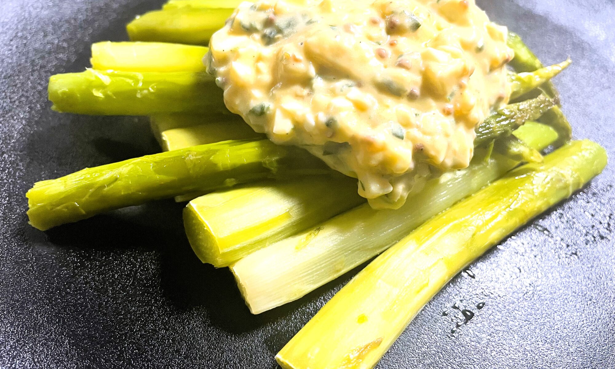 ホワイト・アスパラガスで本来作られるものですが、日本では新鮮なホワイト・アスパラガス供給量が少ないのか中々見かけないので、グリーン・アスパラで代用するとよいと思います。