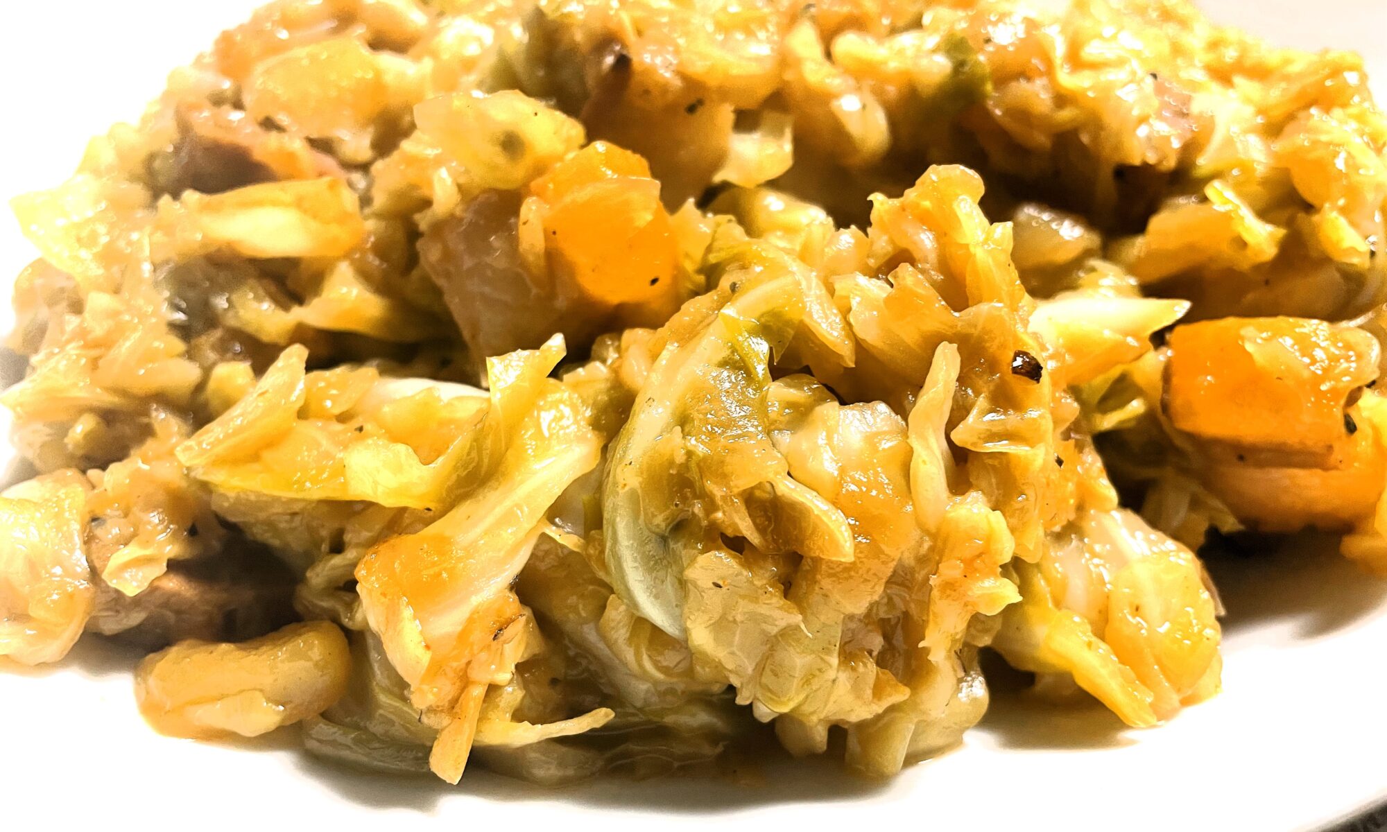 この料理はキャベツの食物繊維が消化を助け、体に優しい一品です。