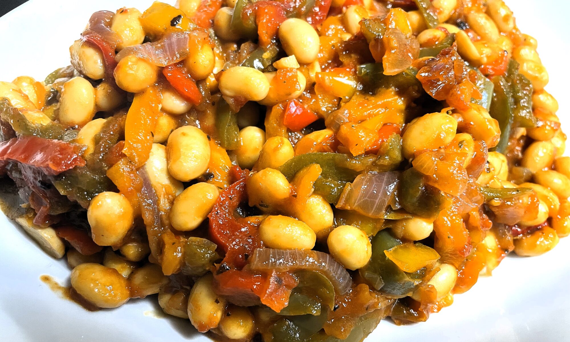 豆のピーマン和えは、ペペロナータ(ピーマン/パプリカの煮込み)の調理法をベースに豆を加えて調整した料理です。