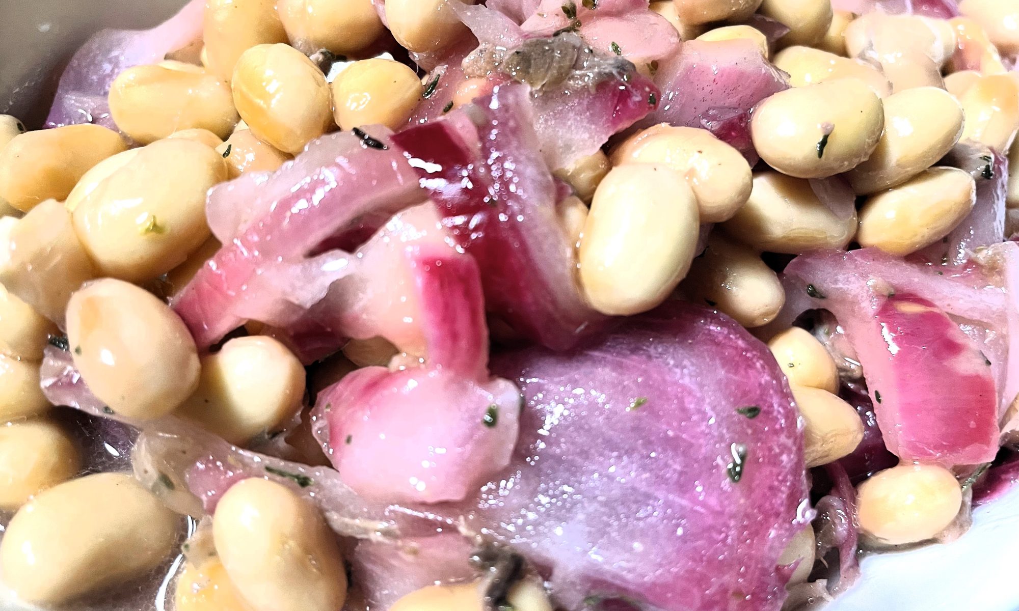 豆の味付けは、エキストラバージンオリーブオイル、刻んだアンチョビ、ニンニク、タイム、胡椒、タマネギを赤ワインビネガーでソースを作り、ドレッシングするだけで風味豊かなとても美味しい料理に早変わりです。