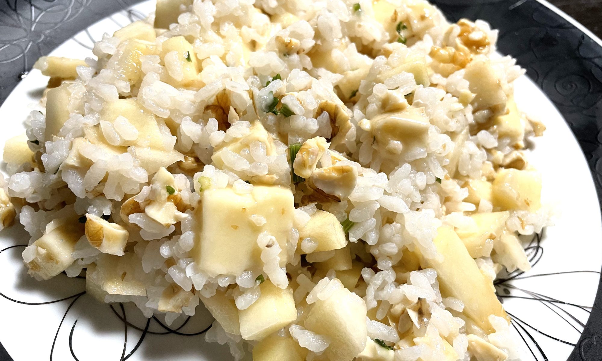 この組み合わせからインスピレーションを得て、僕は林檎と胡桃、チーズを組み合わせたライスサラダを考案しました。