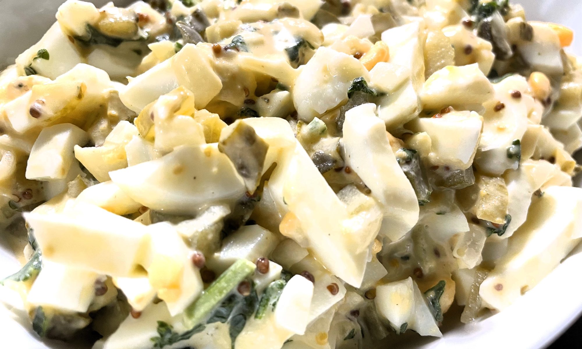 茹で卵とピクルス、玉ねぎを自家製マヨネーズとマスタードを使ったソースでドレッシングして完成です。