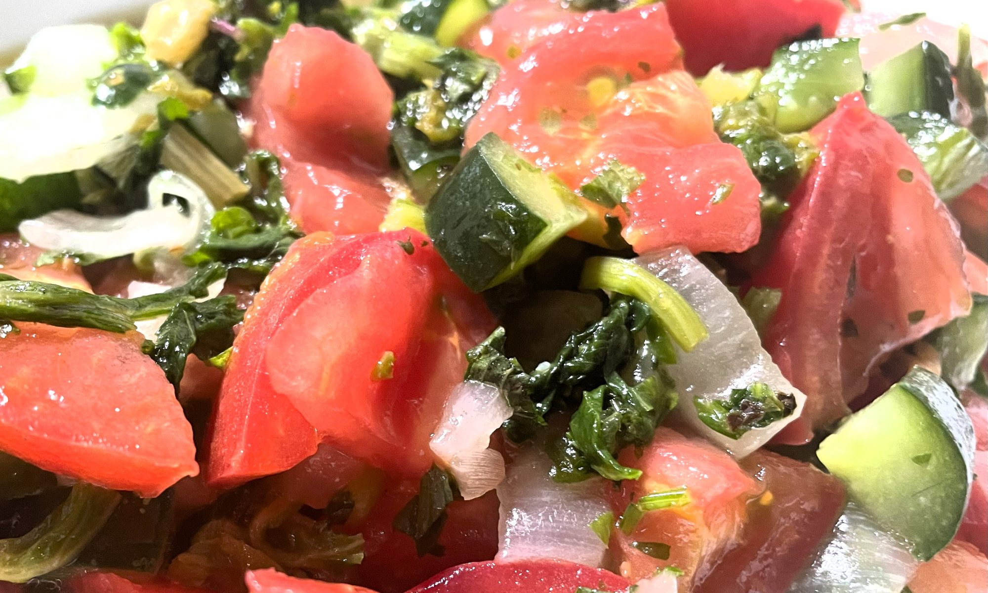 サラダでもよくつかわれる玉ねぎやトマトの組み合わせにきゅうりが入った形ですが、このきゅうりの風味と複数種類の香草(ハーブ)の豊かな香りが特徴のペルシャ料理のサラダです。