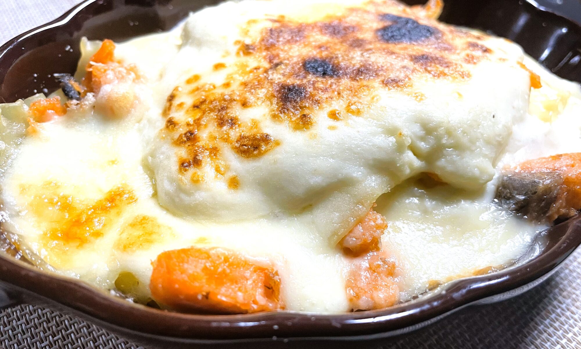 ベシャメルとモッツァレラが主役といってもよい分量で食べ応えをつくり、サーモンが美味しい風味を出しているといった印象です。その為、ベシャメルは結構固めのバター:小麦粉:牛乳比:1:1:10でよいと思います。