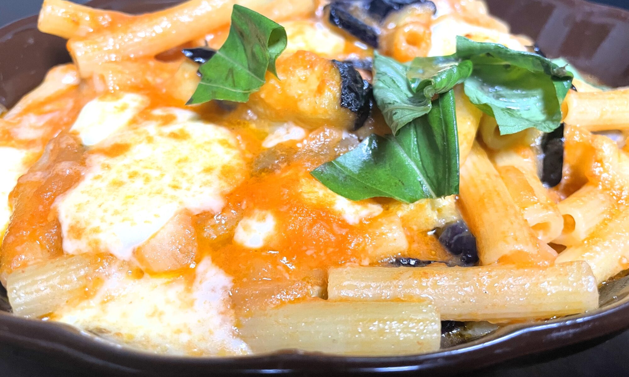 この料理は、揚げ茄子とオーブンで焼いたフィオル・ディ・ラッテ(モッツァレラによく似たチーズ)をソースに絡めた絶品パスタです!