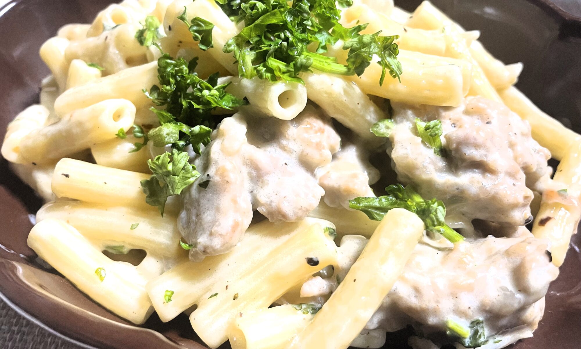 やわらかで美味しいあのソーセージの中身の風味をクリームで閉じたソースで食べるパスタです。