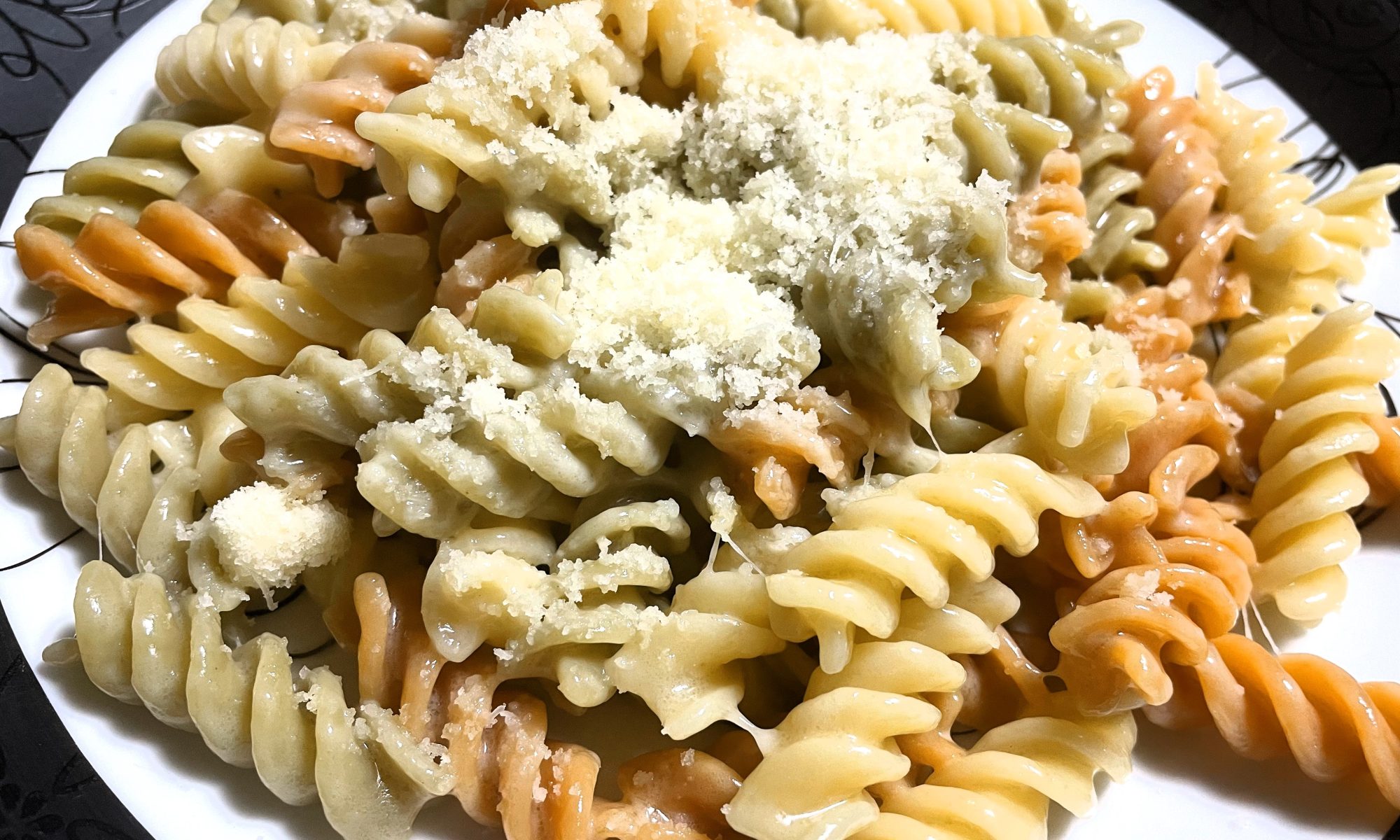 パスタはスパゲッティで調理するケースが多いそうですが、ショートパスタで調理することもあるようですので、画像ではちょうど見つけたトリコロールのパスタ(フジッリ)を使用しています。
