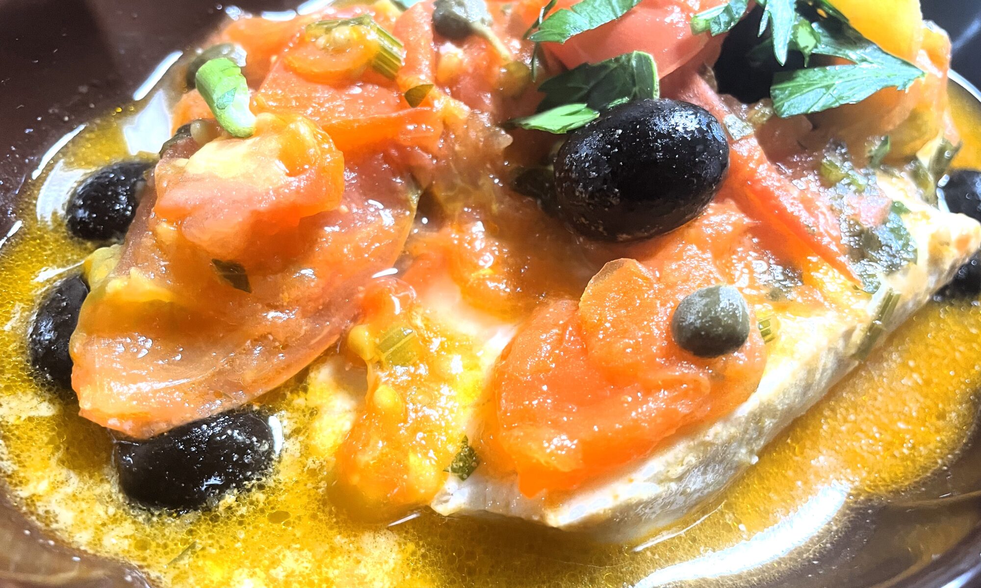 チェリートマト、オリーブ、ケッパーで構成されるソースで地中海の美味を堪能できますよ!