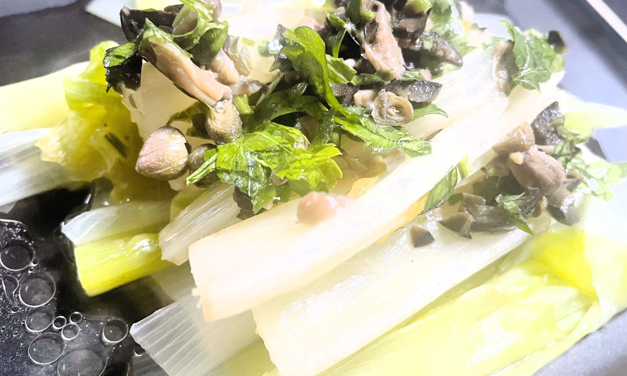 今回、ネギとセロリを主役として、アンチョビとケッパーにオリーブとパセリを加えたマリネにしています。