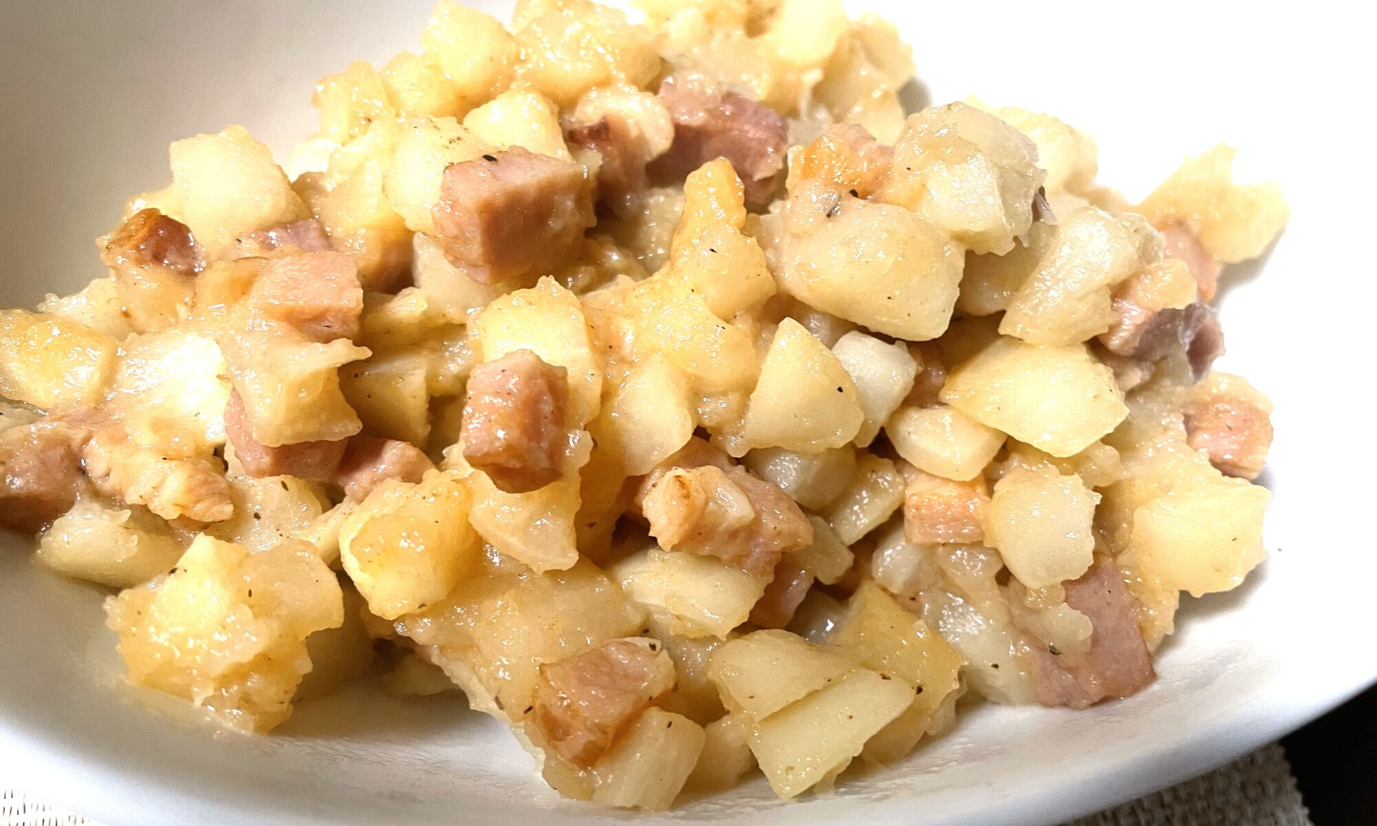 フライパンでオリーブオイルを熱し、立方体にカットしたベーコンを入れ、ほんのりきつね色になったら、角切りにしたカブ、下塩を加えて炒めます。