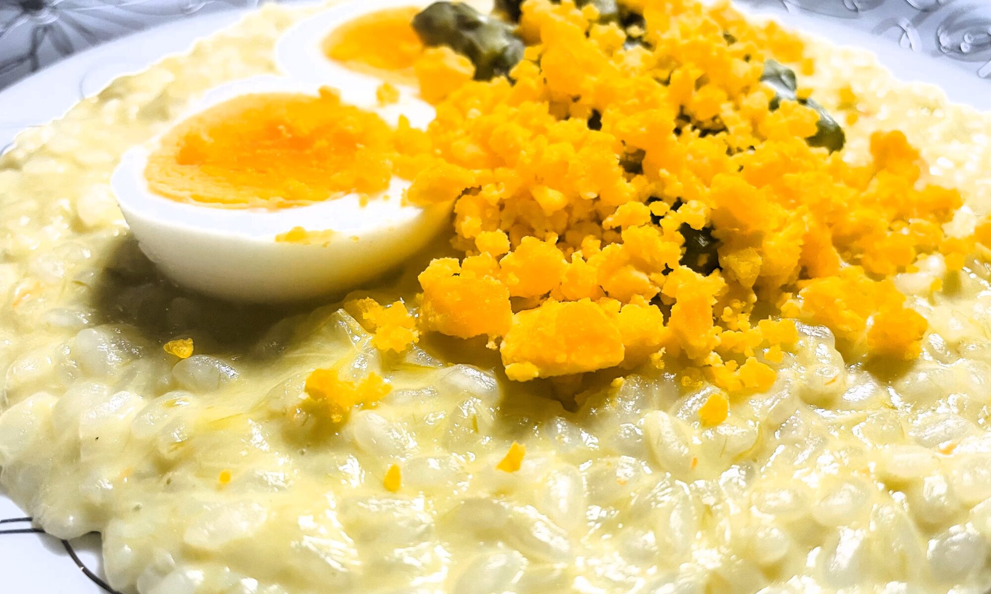 事前準備として、アスパラガスの下処理とゆで卵を作る必要がありますが、調理そのものは通常のリゾットと変わりません。