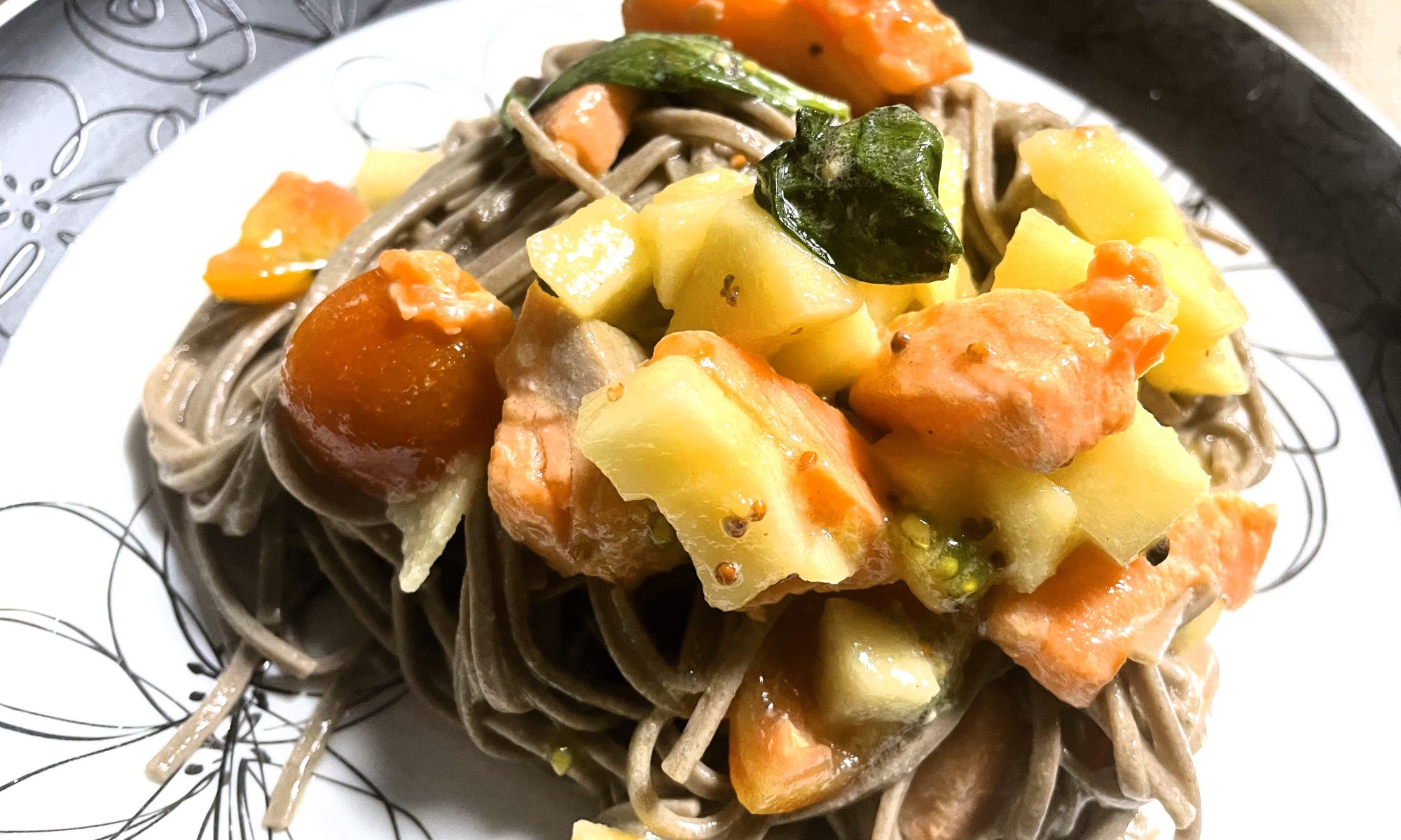 そば粉のタリオリーニで作るサラダであるこのレシピは、00粉とそば粉を5:5として卵を加えて混ぜて作られる平たいパスタ(タリオリーニ)を使用したサラダです。